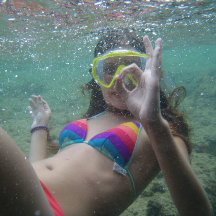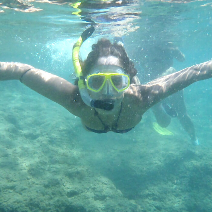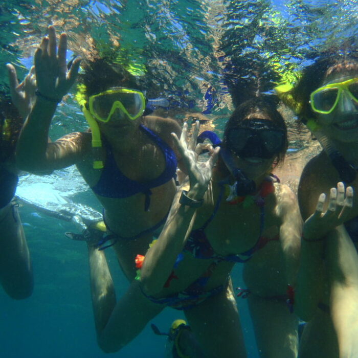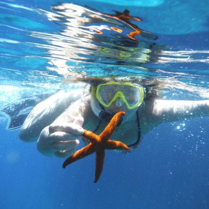 La manera más fácil de poder observar el fondo marino es con gafas de bucear, acompañarnos con un tubo para no tener que sacar la cabeza del agua sin perder de vista lo que estemos observando y si empleamos aletas para propulsarnos podríamos ser casi sirenas. Somos partidarios de llevar camisetas térmicas o trajes cortos de neopreno, aunque sea verano nuestro cuerpo nos lo agradecerá. Una vez equipados realizaremos una ruta explicativa donde nuestros guías nos irán contando lo que el mar ese día quiera mostrarnos. Sargos, salpas, castañuelas, esponjas, pulpos e incluso alguna manta raya o tortuga.